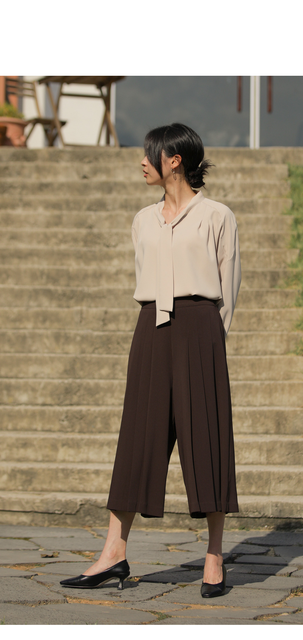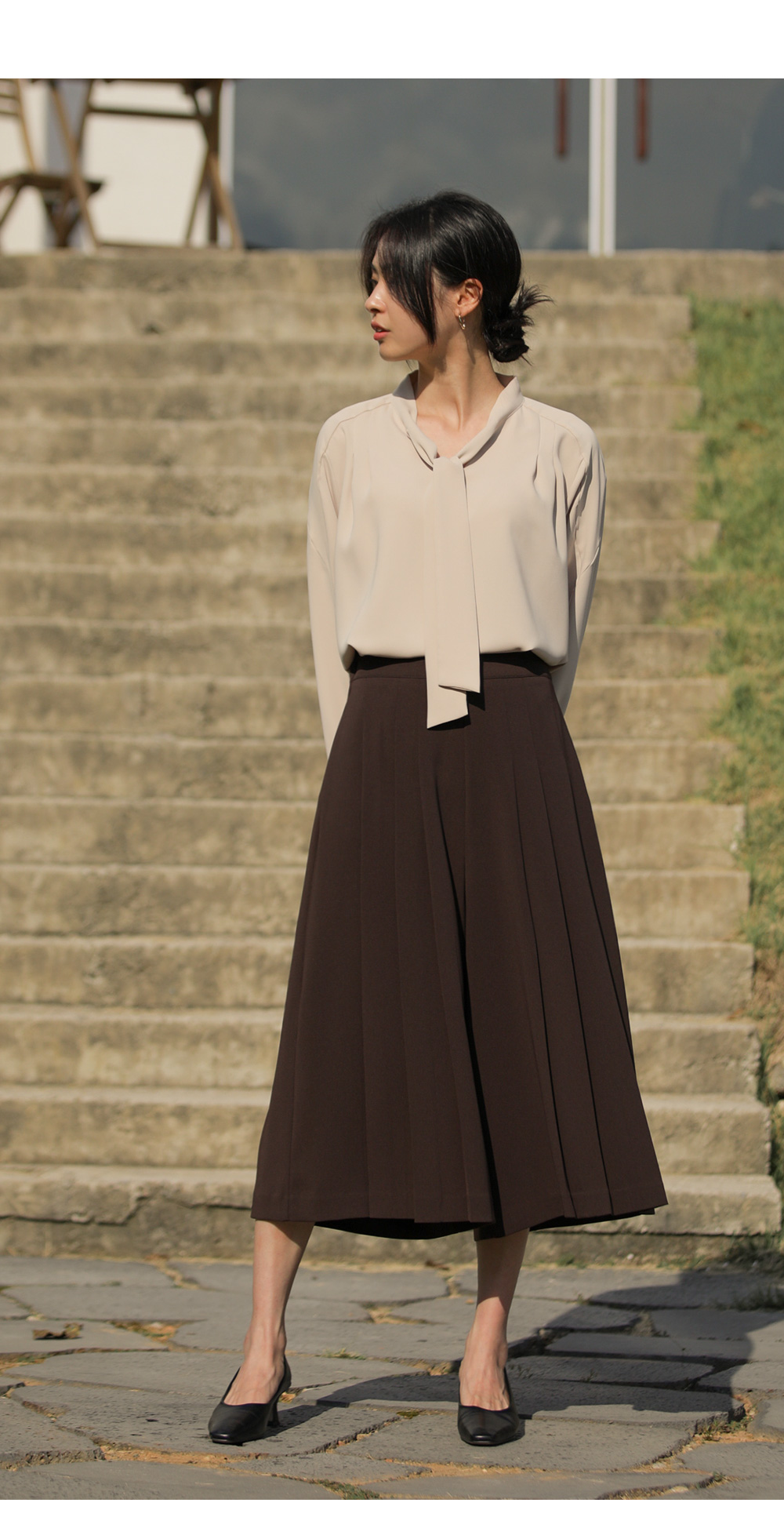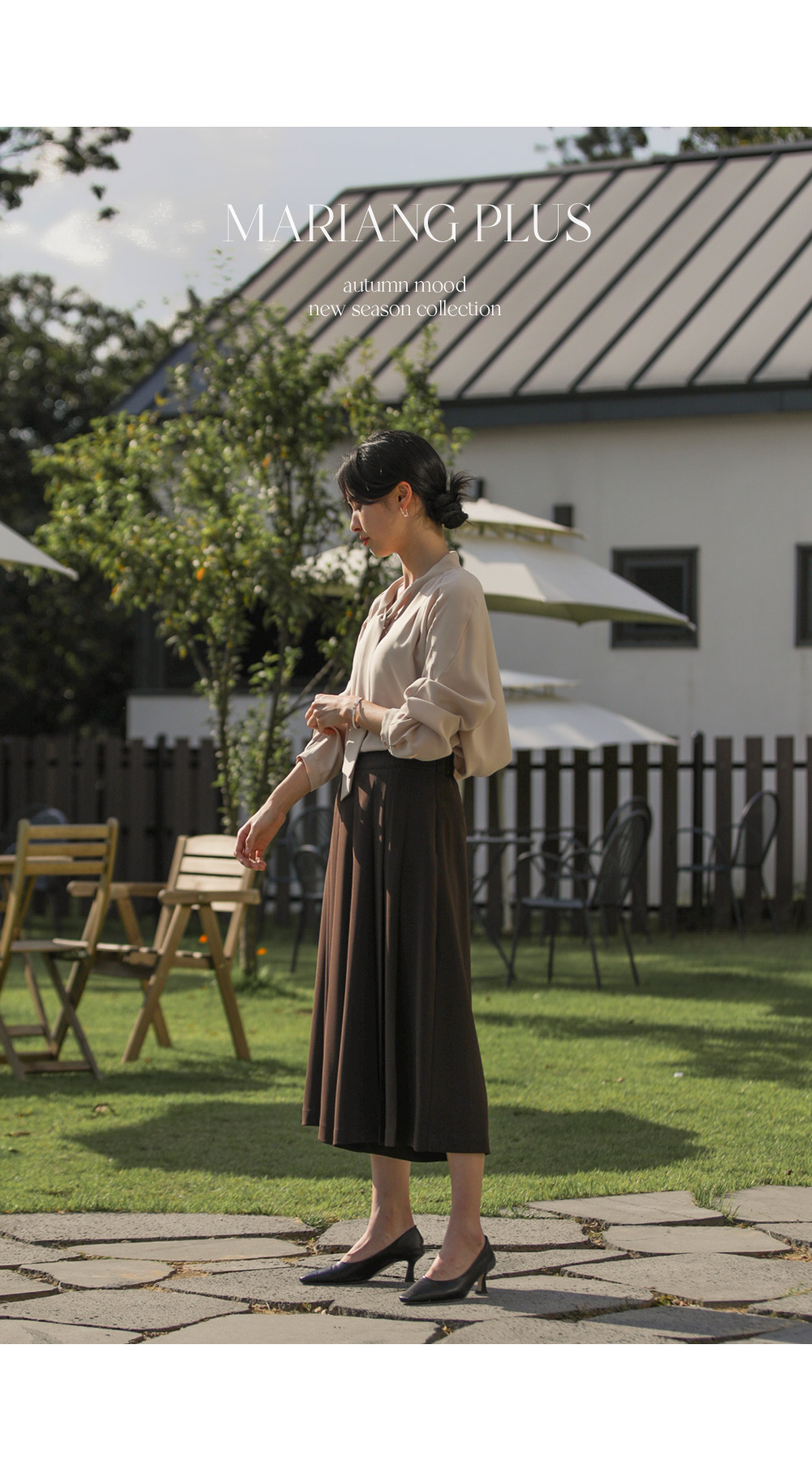 유로크 주름 치마바지 마리앙 플러스에서만 만나볼 수 있는 포멀함과 페미닌한 무드를모두 느낄 수 있는 하이 퀄리티의 치마바지입니다. 스판이 함유된 폴리 소재로 제작되어 답답함이 없이 착용되며 와이드한 핏으로 더욱 편안한 팬츠입니다. 유연한 소재감이 주는 포멀한 무드로 슬랙스인 듯 스커트인 듯 웨어러블한 연출이 가능한 아이템이에요. 플리츠 주름으로 단정하게 정돈된 실루엣으로 체형을 커버하며 로맨틱한 감성까지 더했으며, 부츠와 함께 트랜디한 스타일링이 가능한 길이감으로 섬세하게 디자인되었습니다. 뒷밴딩으로 편안하고 실루엣에 방해가 없도록 제작되었고, 힙 라인의 페이크 립 포켓을 더해 힙업 효과까지 더해드렸습니다. 한 쪽 사이드 지퍼 디테일로 인해 포켓은 한 쪽에 히든으로 더해 균형감을 해치지 않고 실용성을 놓치지 않았습니다. 완성도 높은 스티치 작업으로 마무리하여 옷 태부터 다른 하이 퀄리티 아이템으로 완성했습니다. 정 사이즈로 추천드립니다. 모델정보 키 167cm / 상의 55 / 하의 26(S) / 신발 240mm코디정보 미샬리 타이 블라우스 _ 베이지 유로크 주름 치마바지 _ 브라운