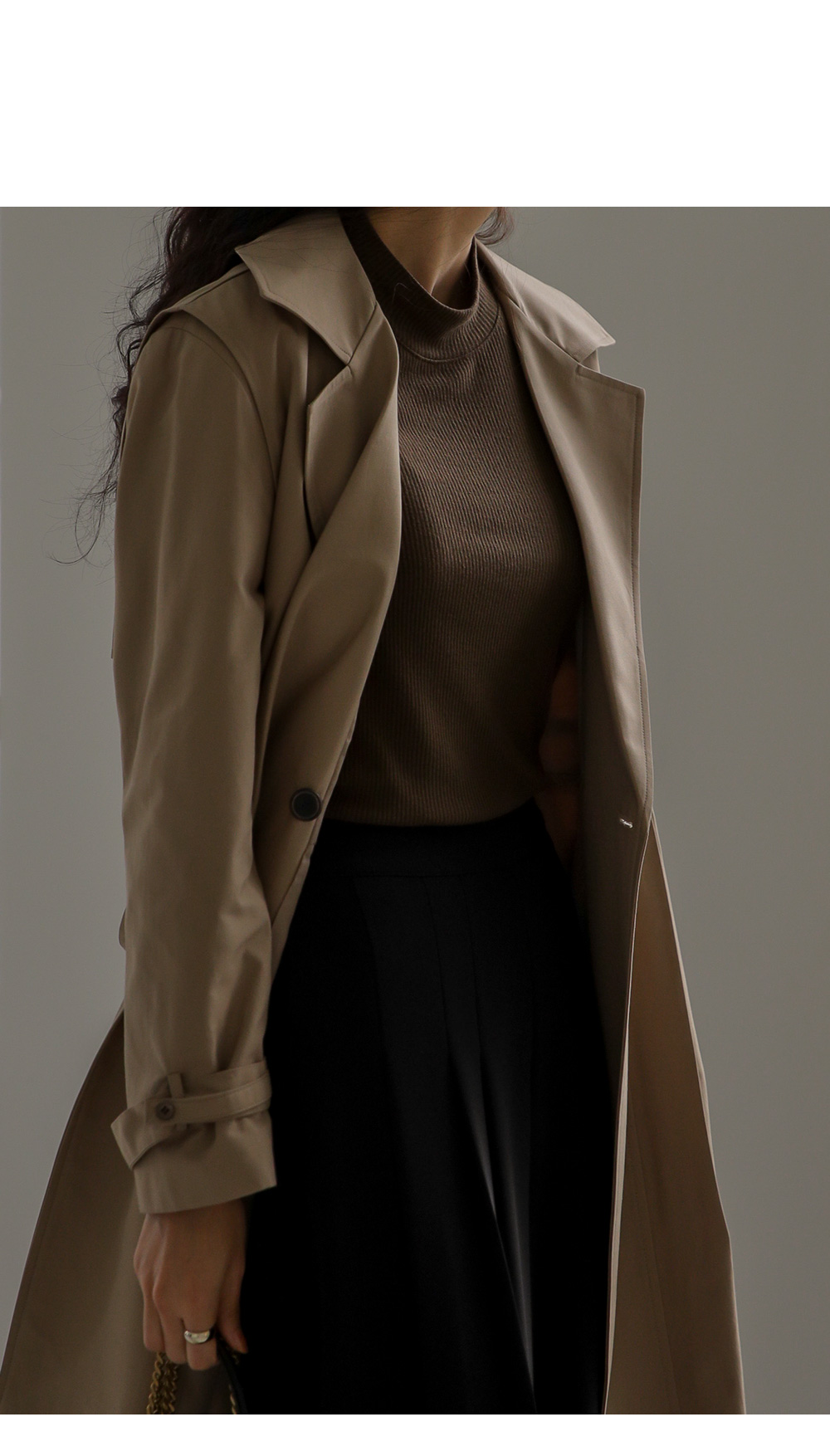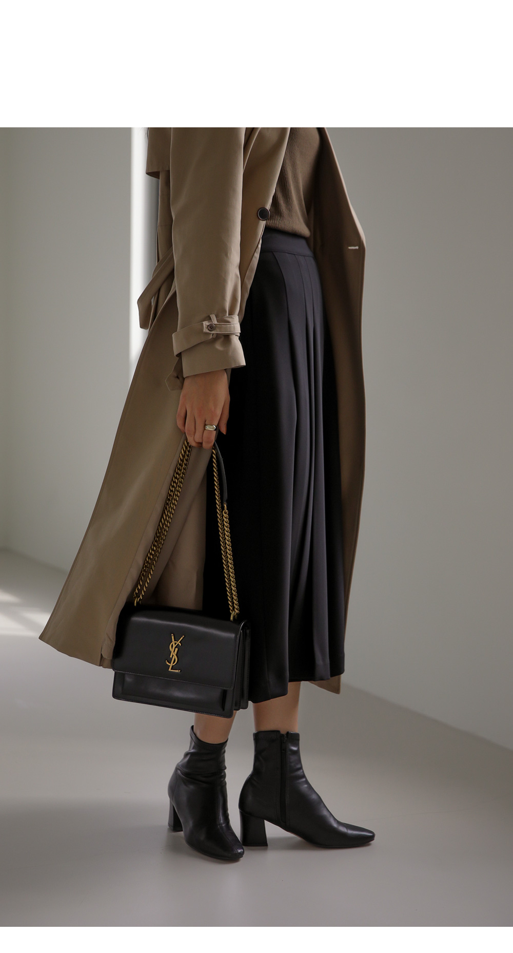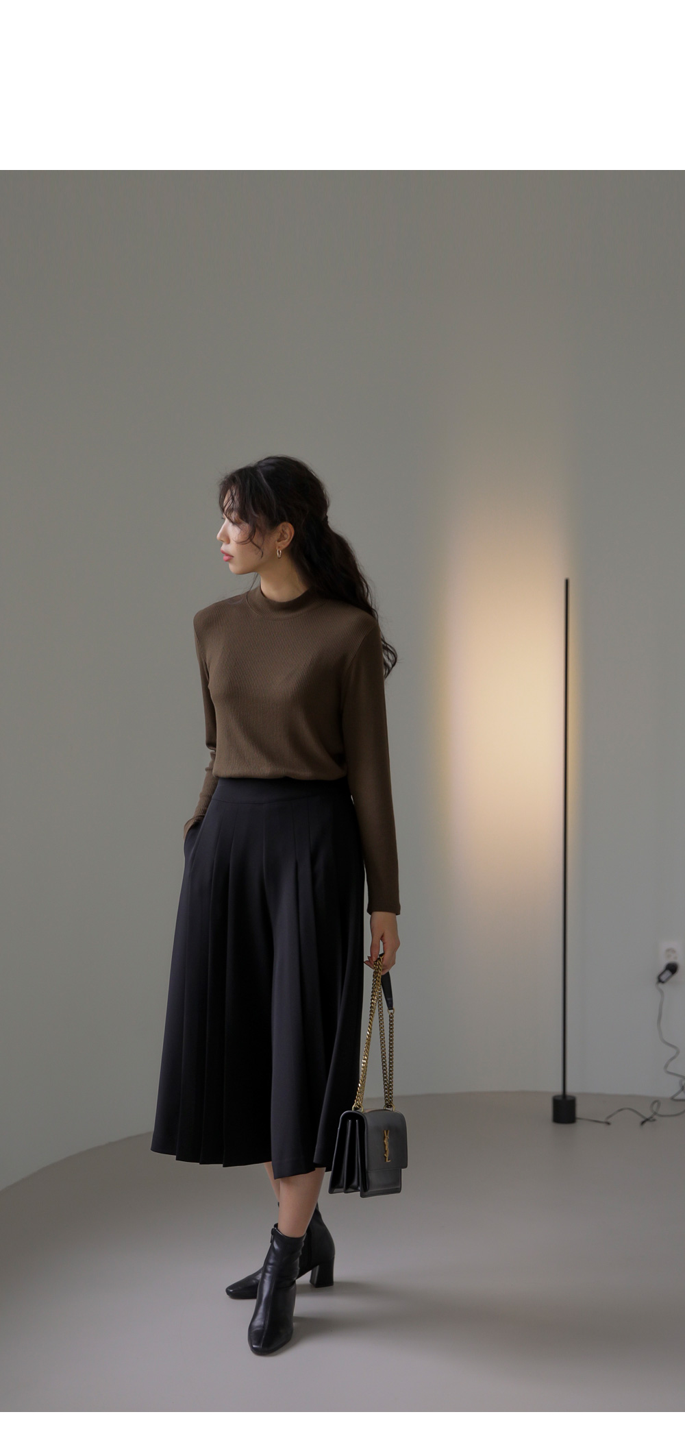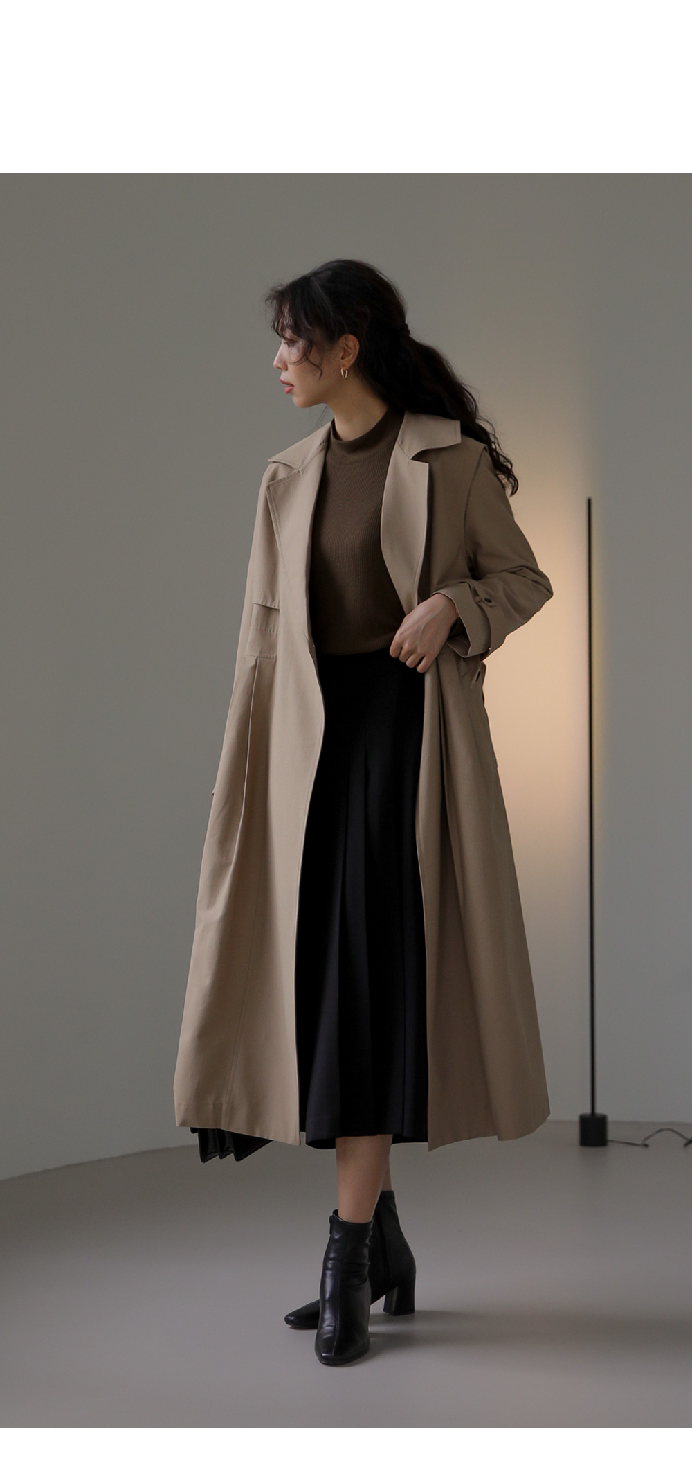 모델정보 키 170cm / 상의 55 / 하의 26(S) / 신발 240mm코디정보 포르크 반목 골지티셔츠 _ 브라운유로크 주름 치마바지 _ 블랙 제리너 트렌치 코트 _ 베이지