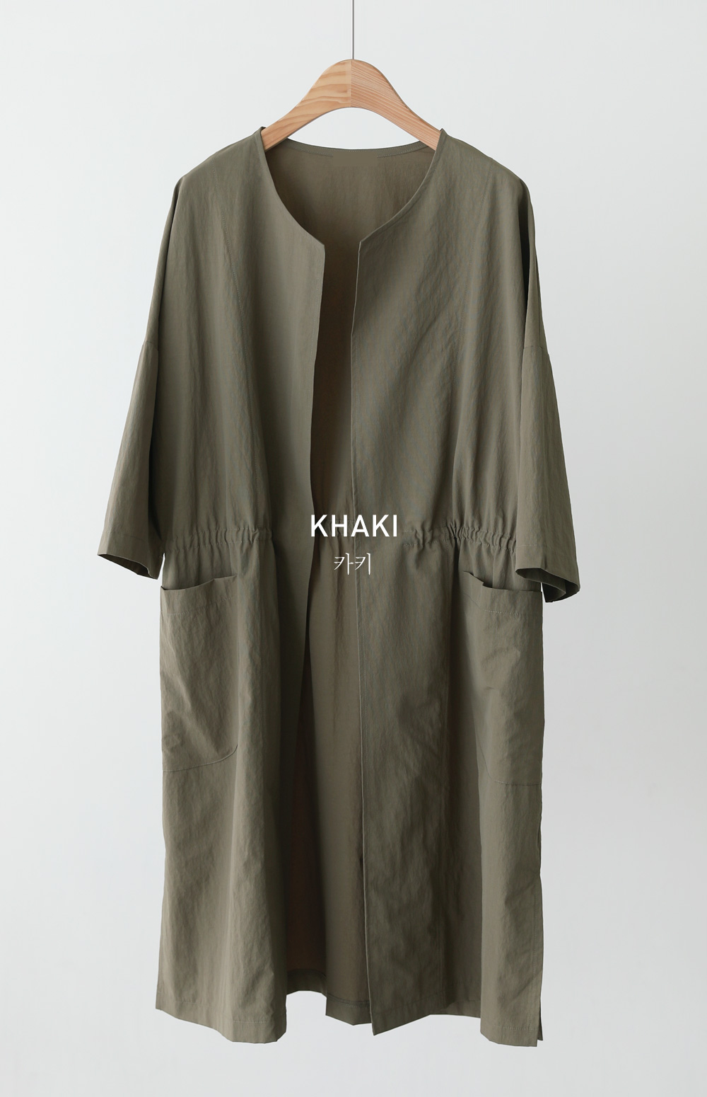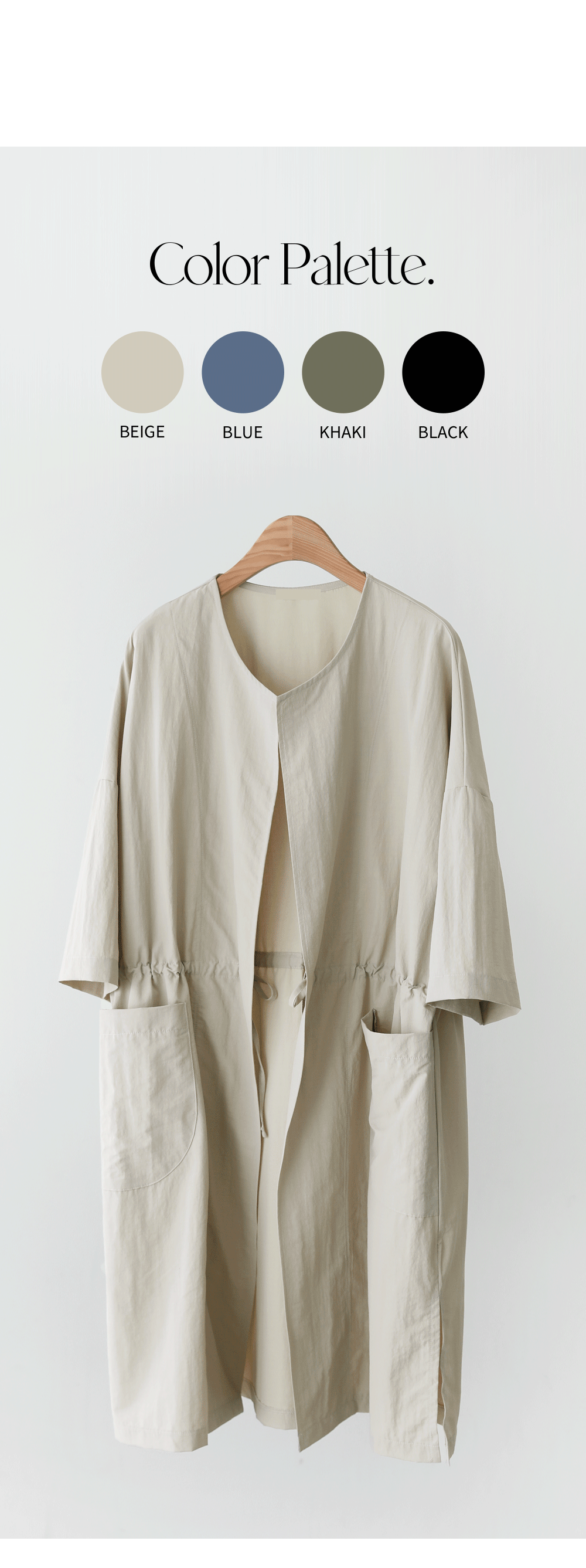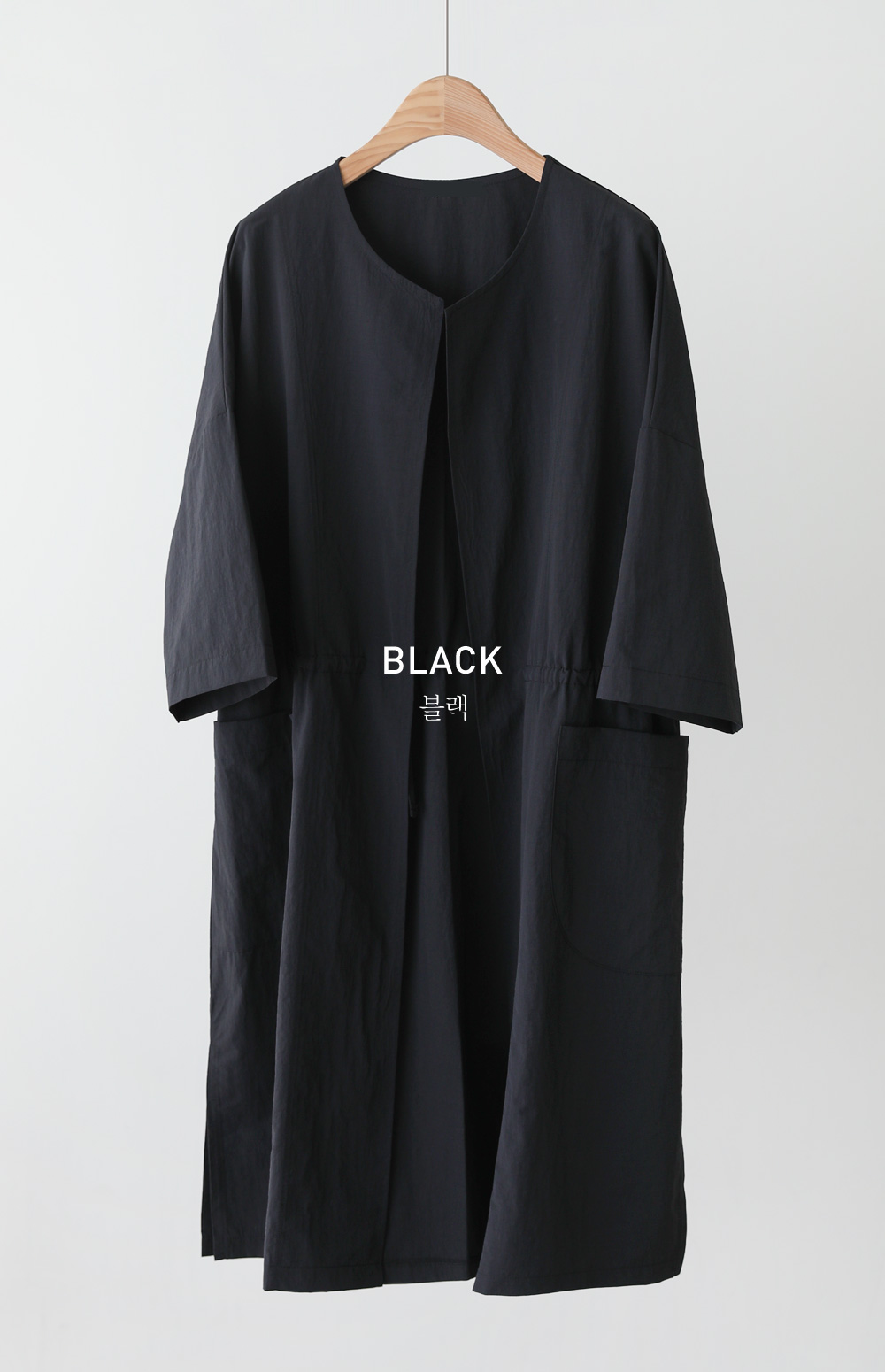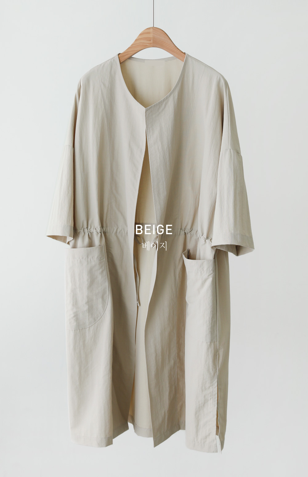 베카스 롱자켓 군더더기없는 깔끔한 실루엣에 베이직한 디자인으로어디에나 이지하게 매치되면서 세련된 무드로 착용되어지는 아우터 소개해드려요 나일론혼방 소재감으로 소재특유의 바스락 거리는 느낌이 쾌적하고 편안하게 착용되어지는 아이템이에요 전체적으로 여유로운 사이즈로 제작되었으며 6부 기장감으로 체형을 어느정도 보완해주면서도 편안하게 착용되는 아이템이랍니다 스트레이트한 핏감이지만 허리라인에 스트링 디테일을 넣어주어 실루엣조절과 사이즈 조절이 가능하며 사이드에 슬릿 디테일을 주어 활동성을 높혀주었답니다. FREE사이즈로 제작되었습니다.