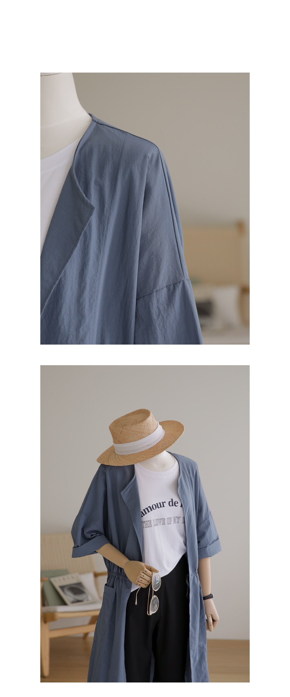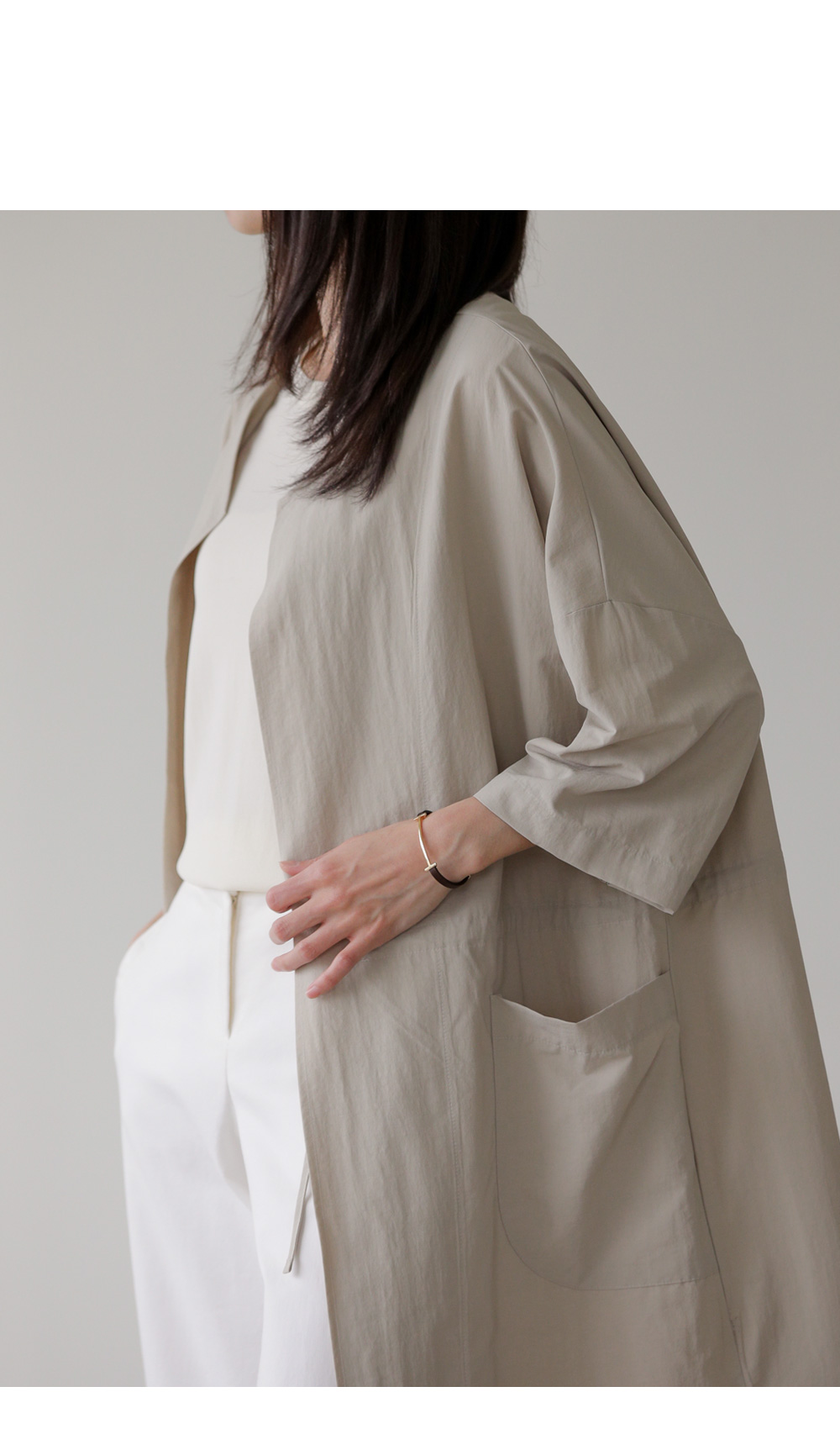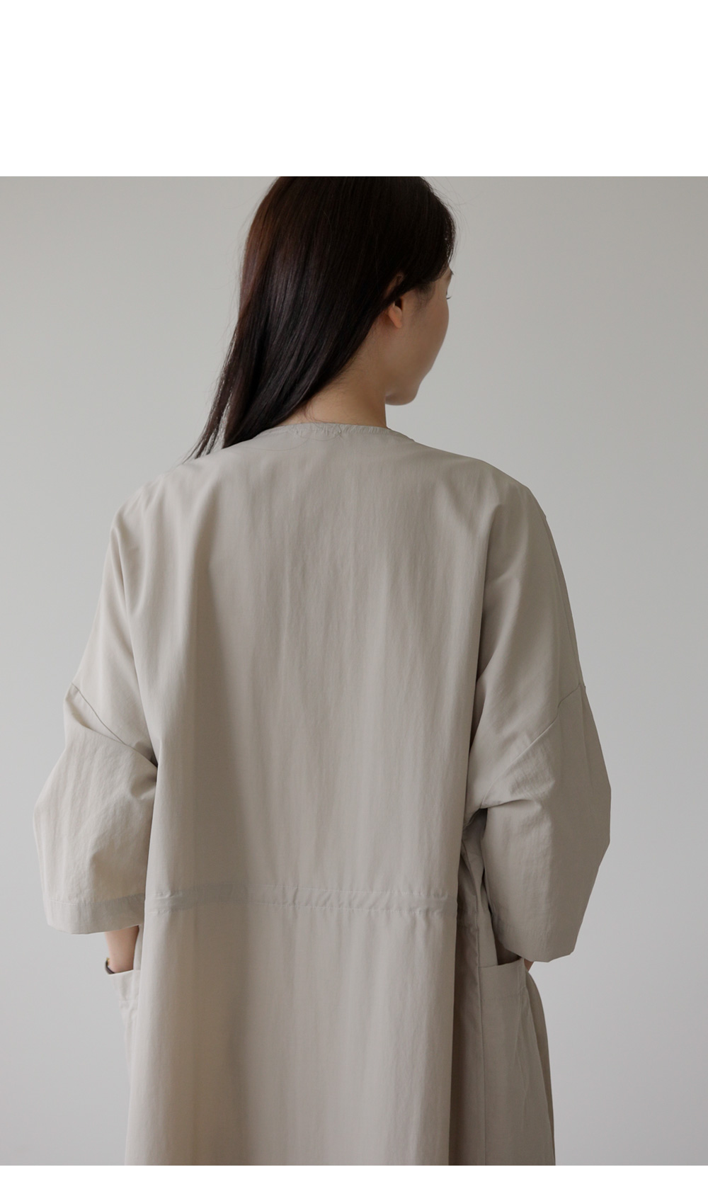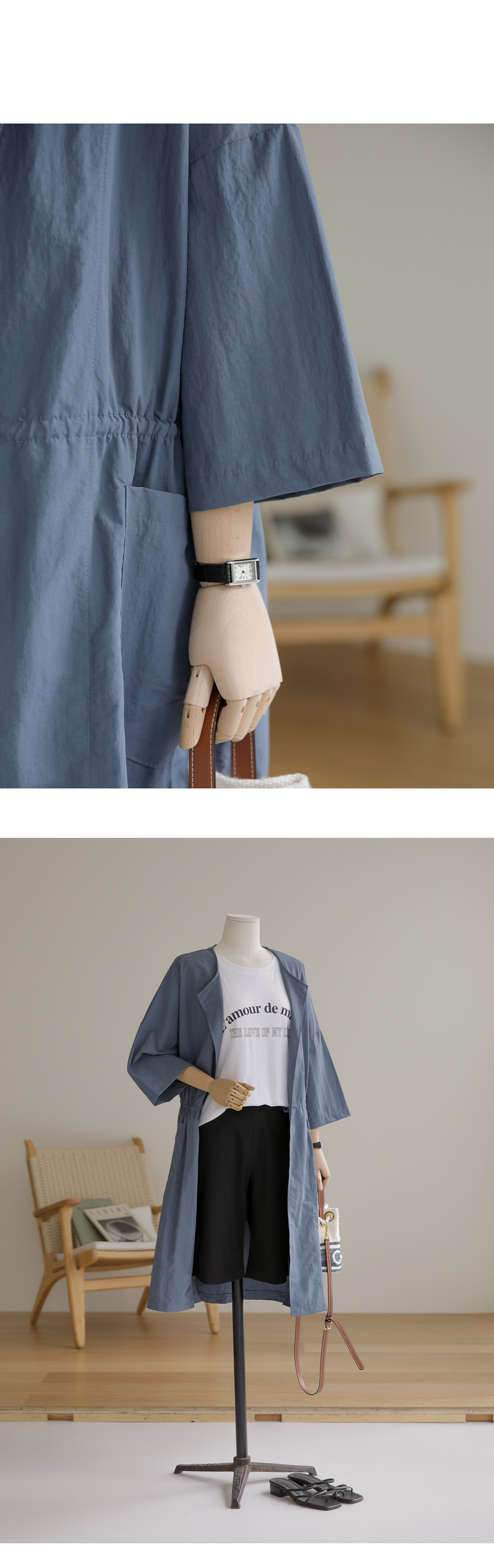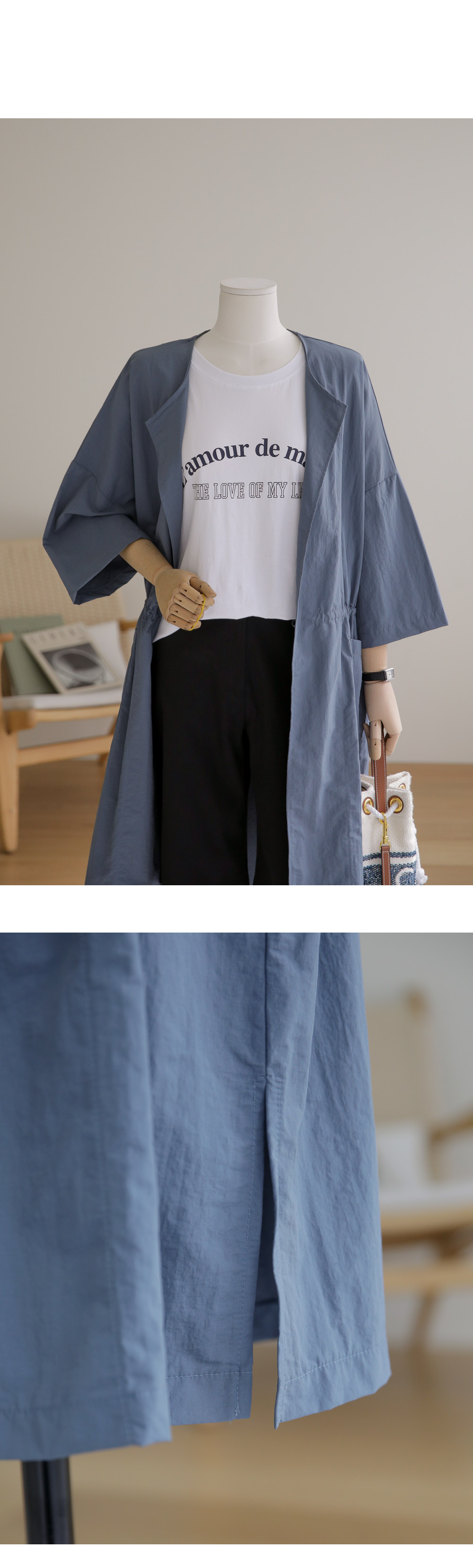 베카스 롱자켓 군더더기없는 깔끔한 실루엣에 베이직한 디자인으로어디에나 이지하게 매치되면서 세련된 무드로 착용되어지는 아우터 소개해드려요 나일론혼방 소재감으로 소재특유의 바스락 거리는 느낌이 쾌적하고 편안하게 착용되어지는 아이템이에요 전체적으로 여유로운 사이즈로 제작되었으며 6부 기장감으로 체형을 어느정도 보완해주면서도 편안하게 착용되는 아이템이랍니다 스트레이트한 핏감이지만 허리라인에 스트링 디테일을 넣어주어 실루엣조절과 사이즈 조절이 가능하며 사이드에 슬릿 디테일을 주어 활동성을 높혀주었답니다. FREE사이즈로 제작되었습니다.