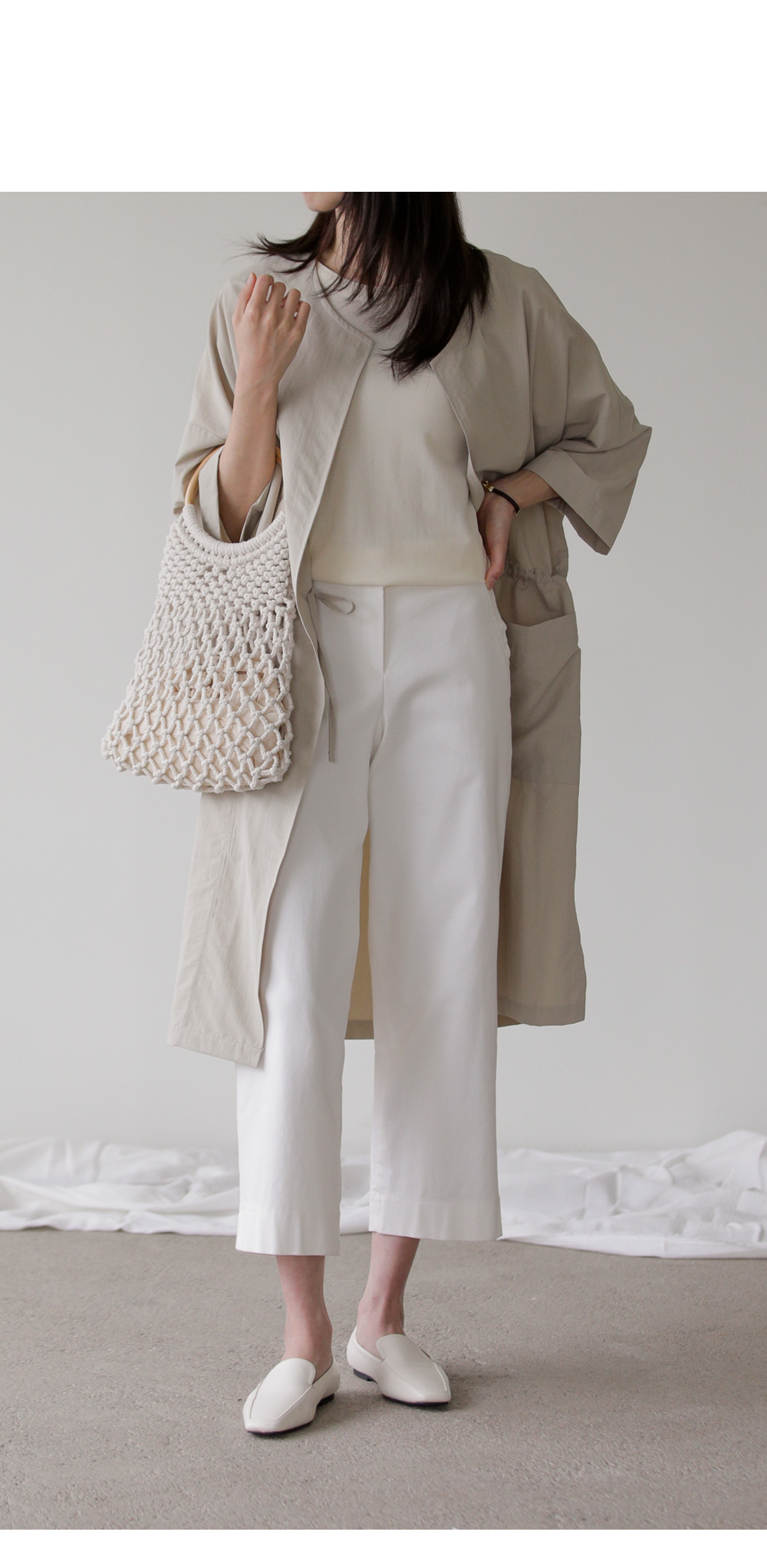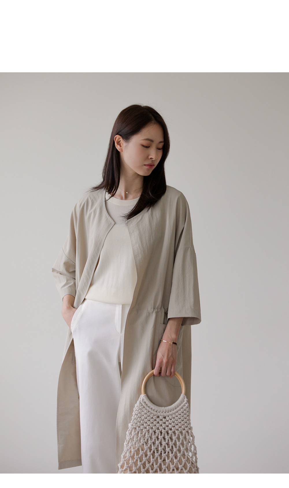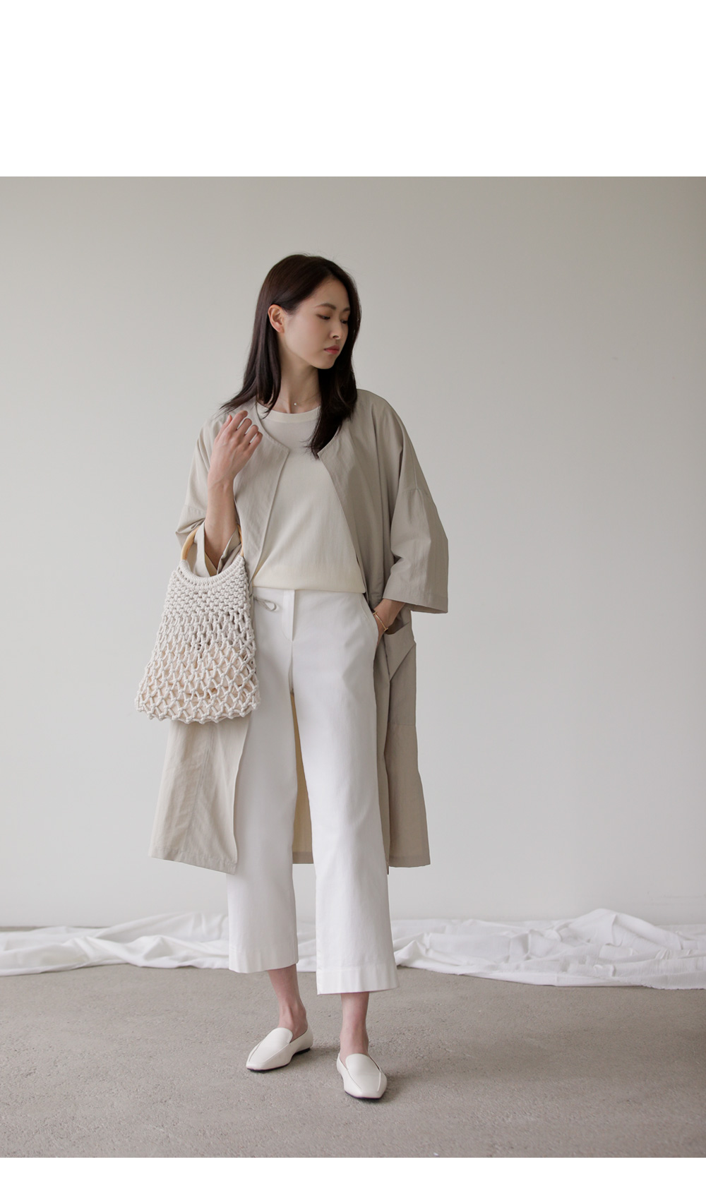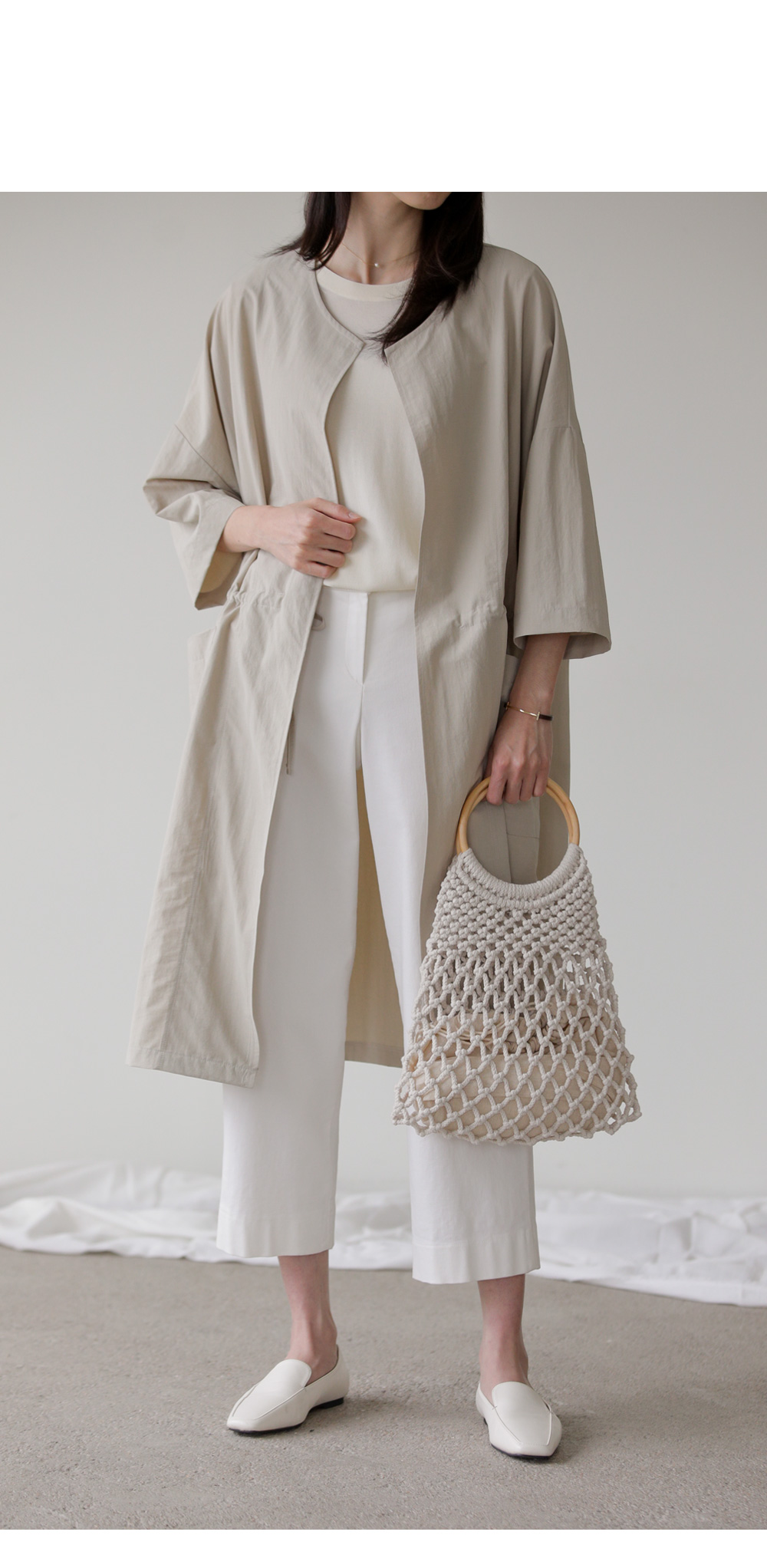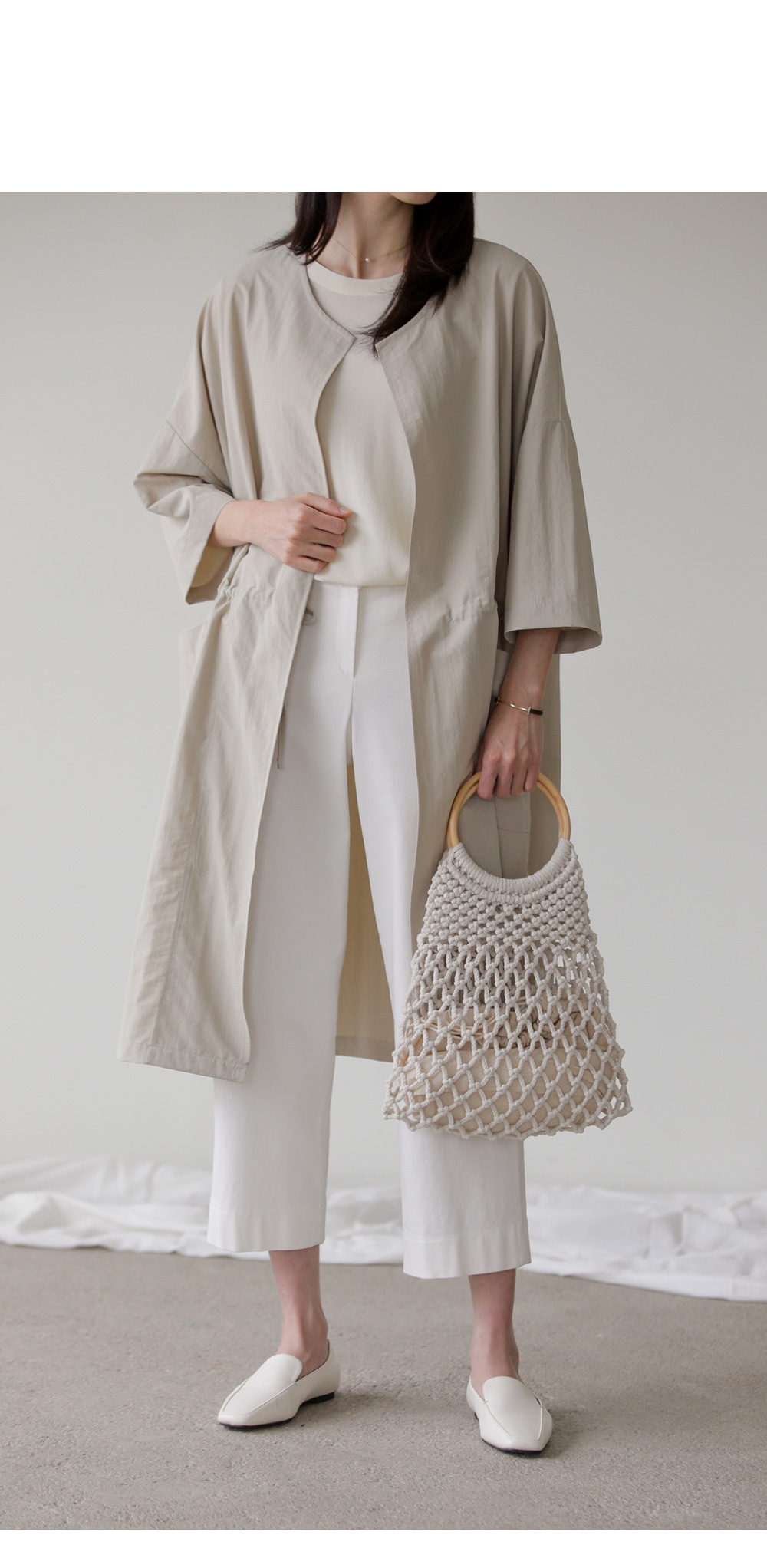 모델정보 키 167cm / 상의 55 / 하의 26(S) / 신발 240mm코디정보 베카스 롱자켓 _ 베이지디카렌 반팔 니트 _ 크림 로조엘 여유일자 팬츠 _ 아이보리