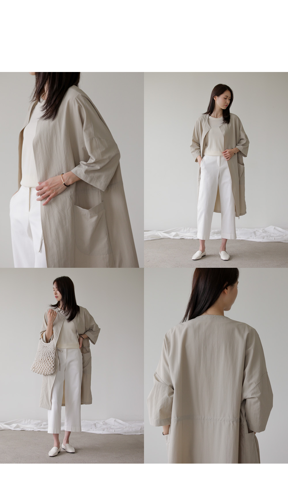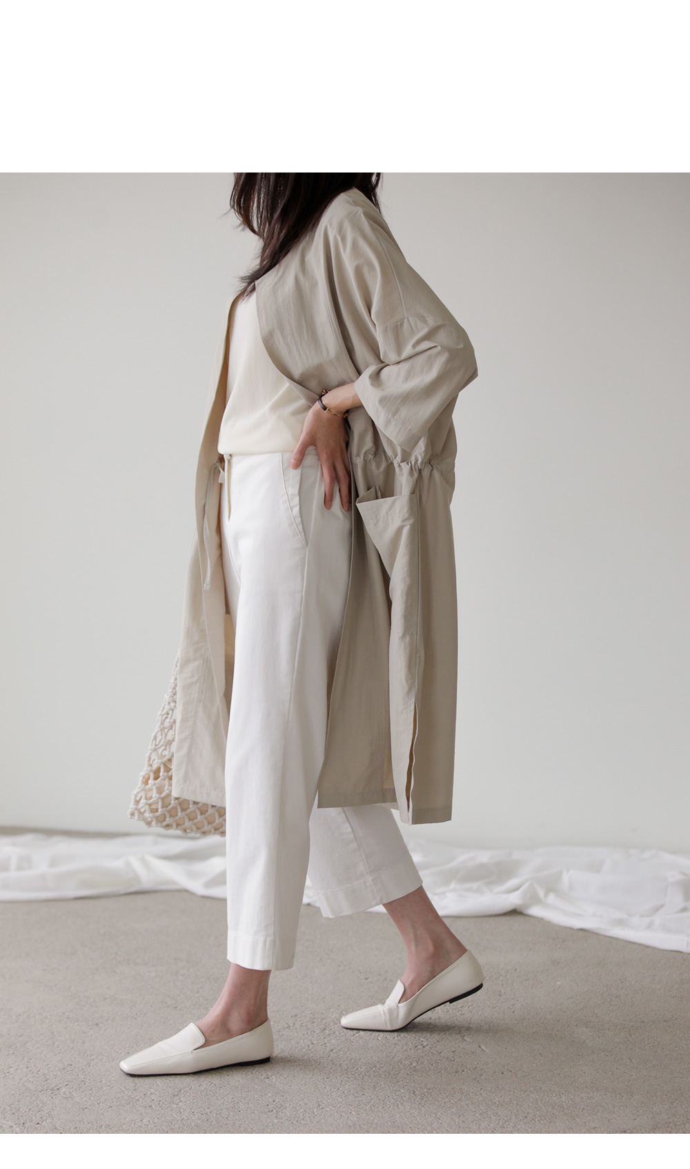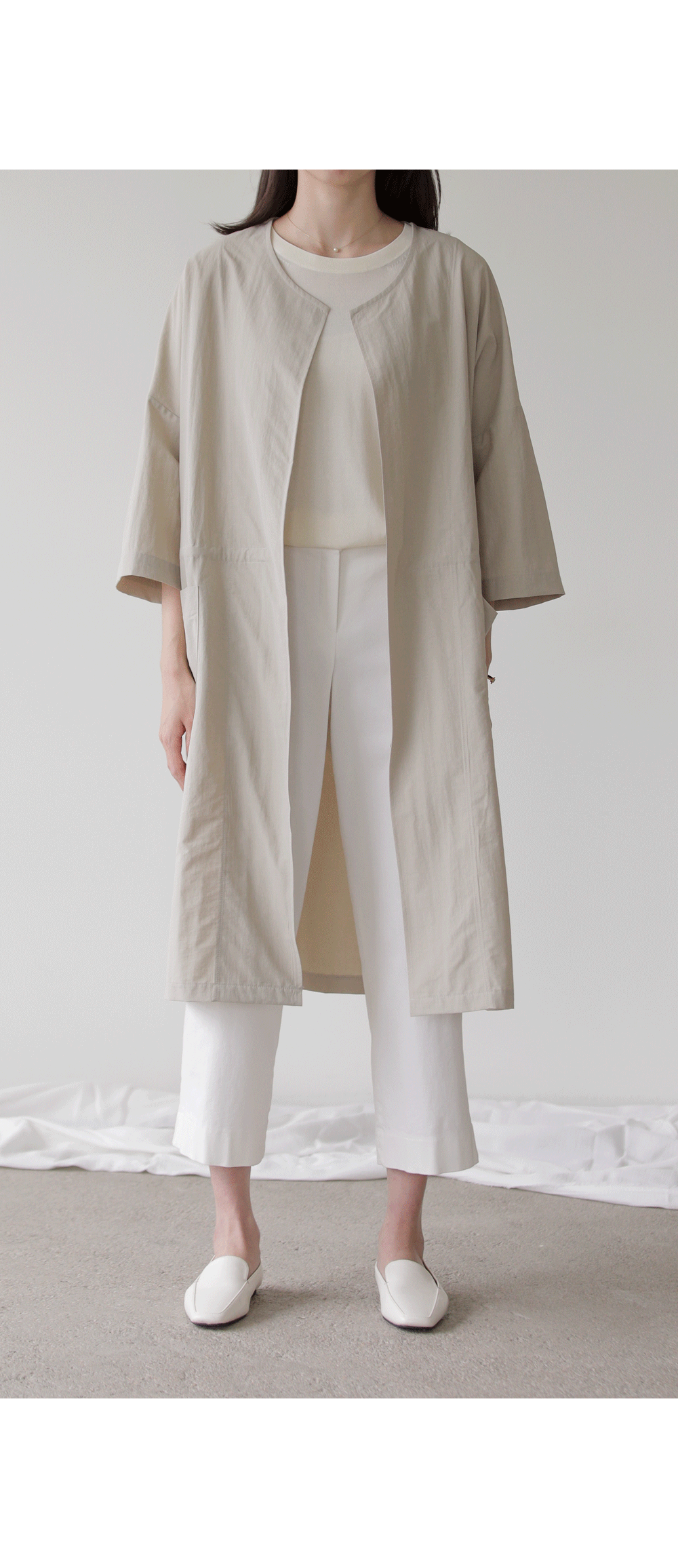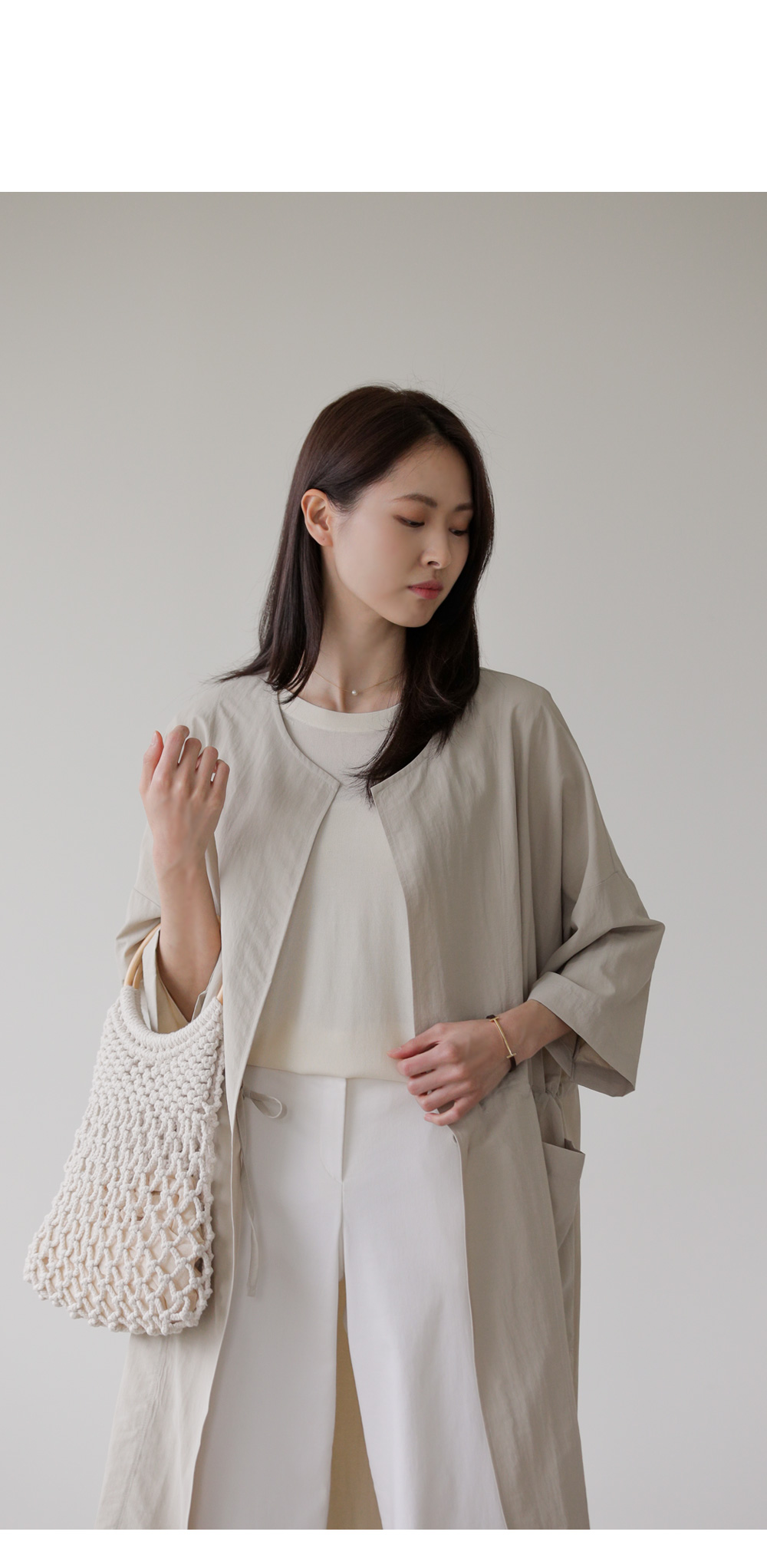 모델정보 키 167cm / 상의 55 / 하의 26(S) / 신발 240mm코디정보 베카스 롱자켓 _ 베이지디카렌 반팔 니트 _ 크림 로조엘 여유일자 팬츠 _ 아이보리