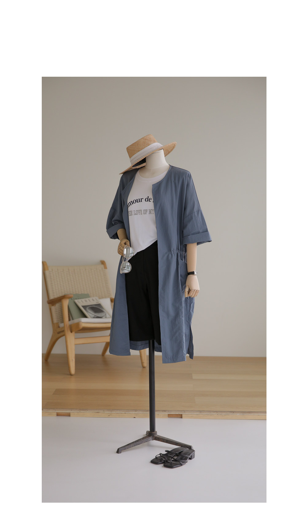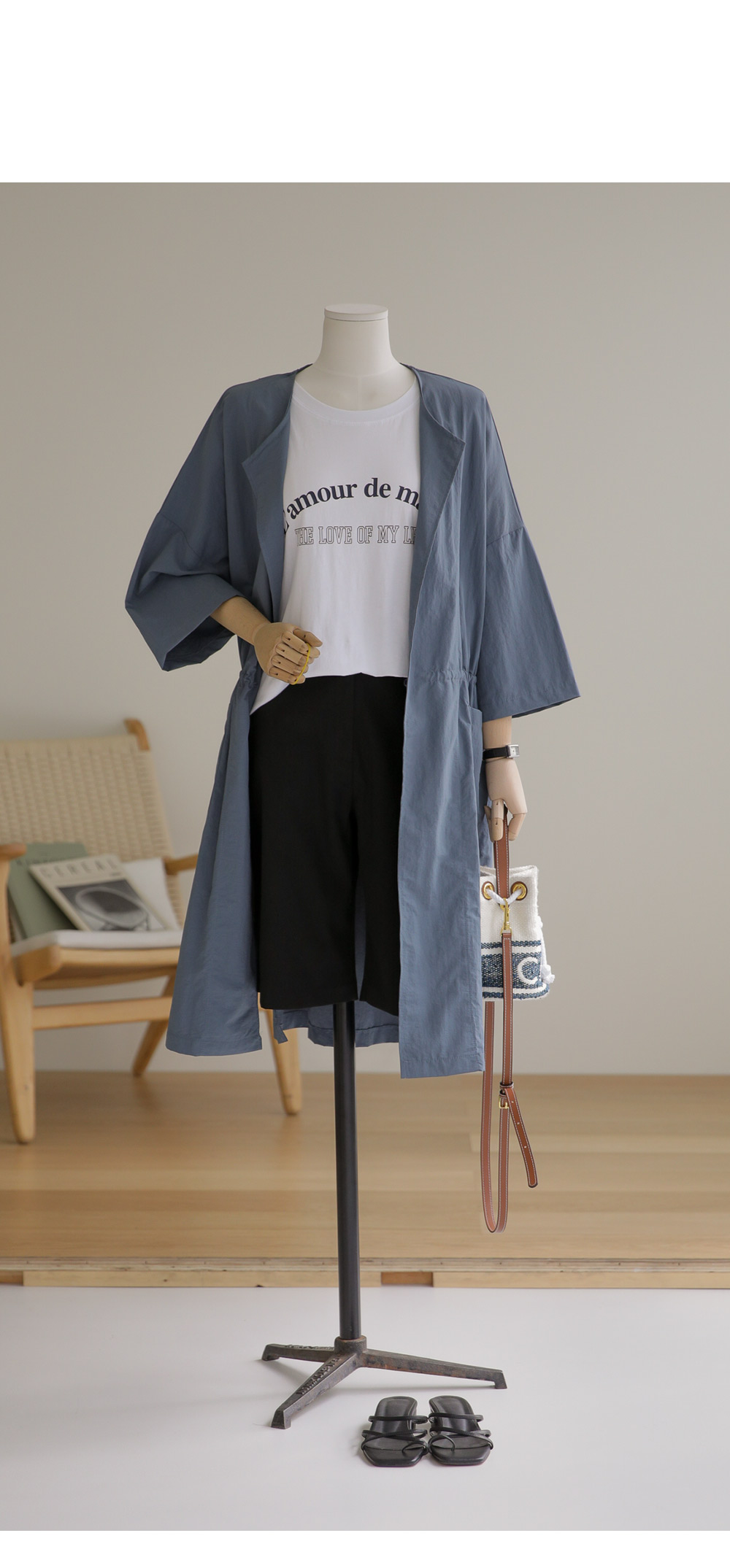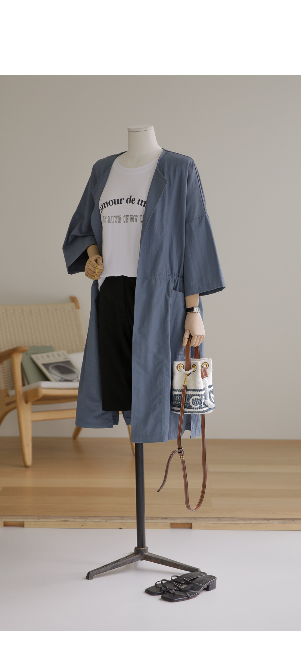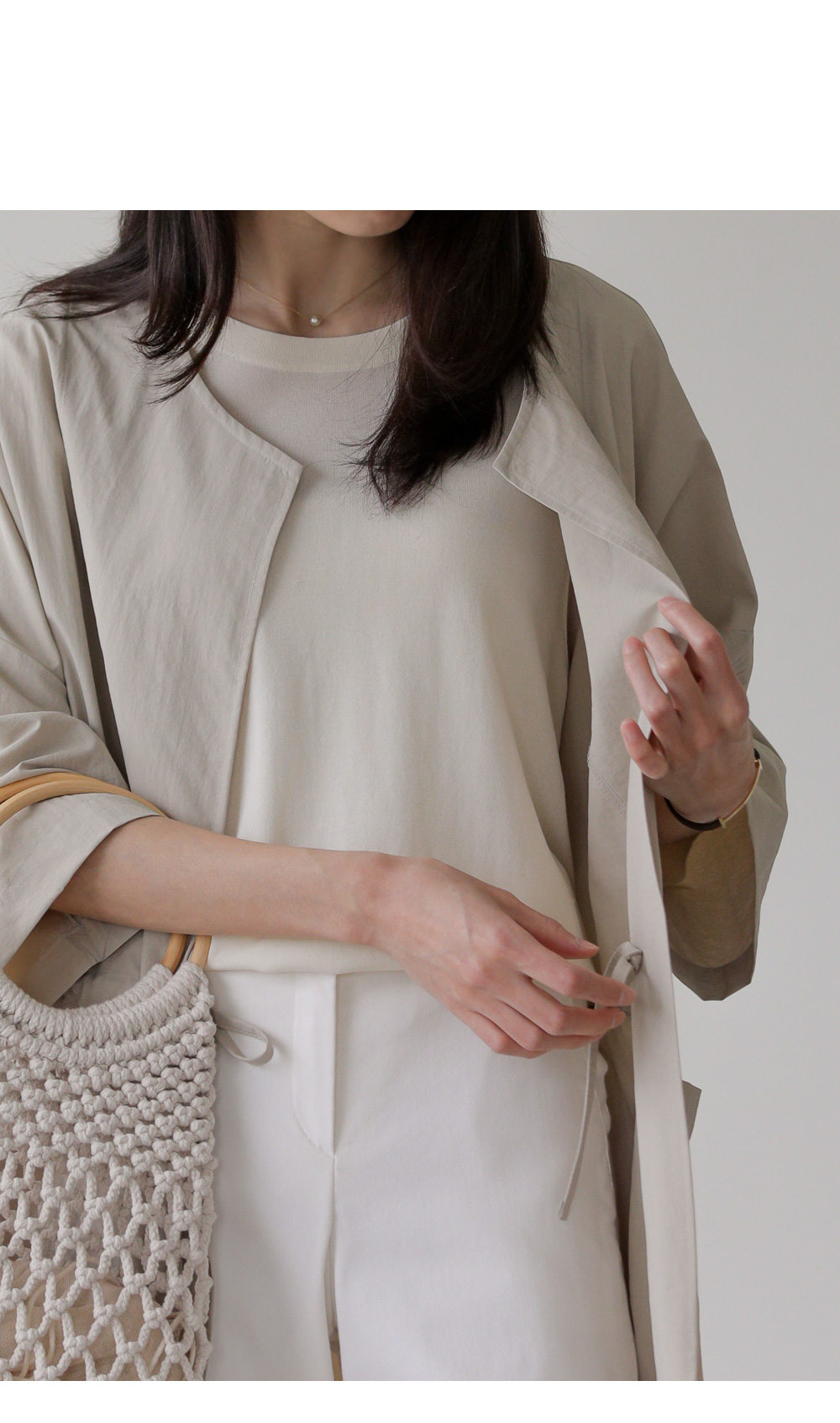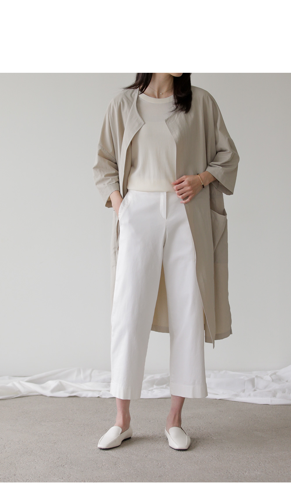 모델정보 키 167cm / 상의 55 / 하의 26(S) / 신발 240mm코디정보 베카스 롱자켓 _ 베이지디카렌 반팔 니트 _ 크림 로조엘 여유일자 팬츠 _ 아이보리