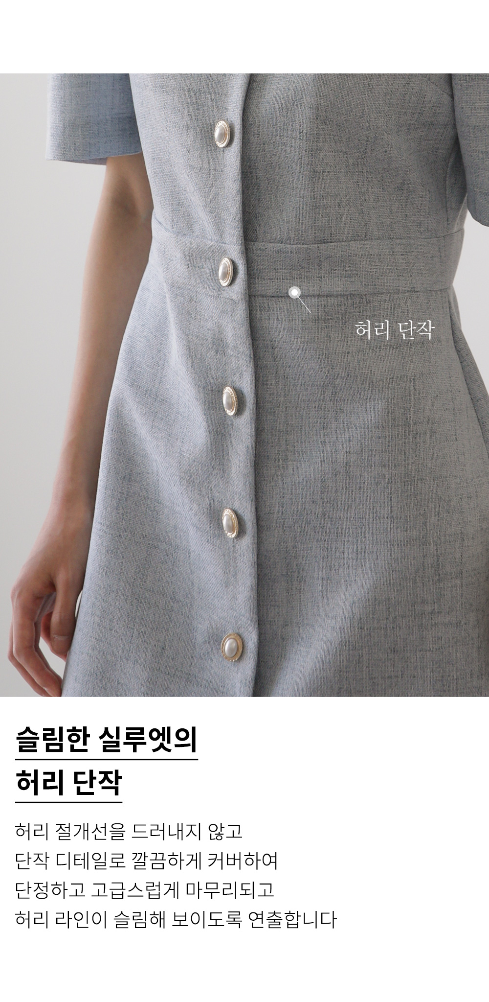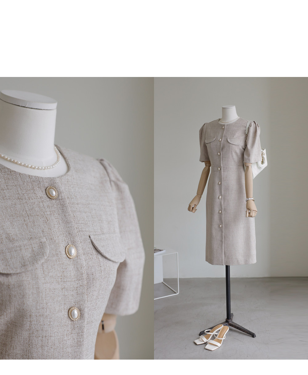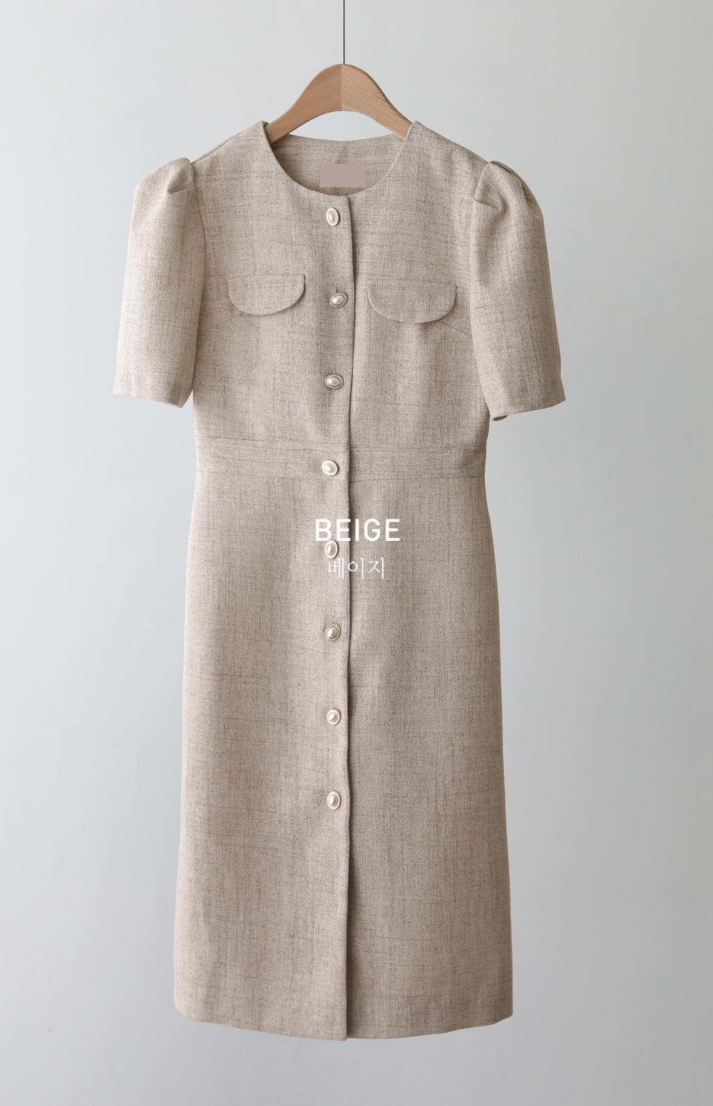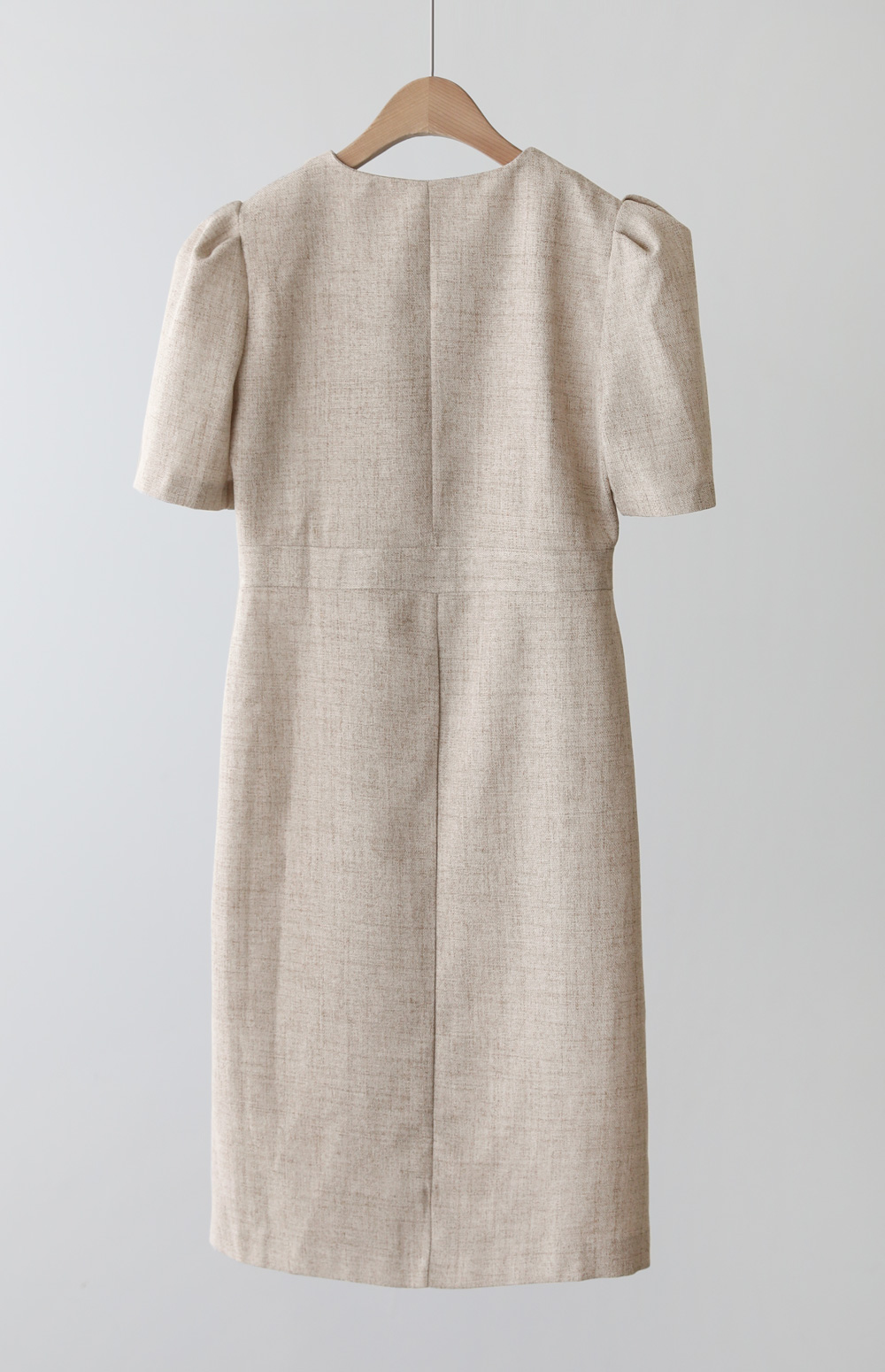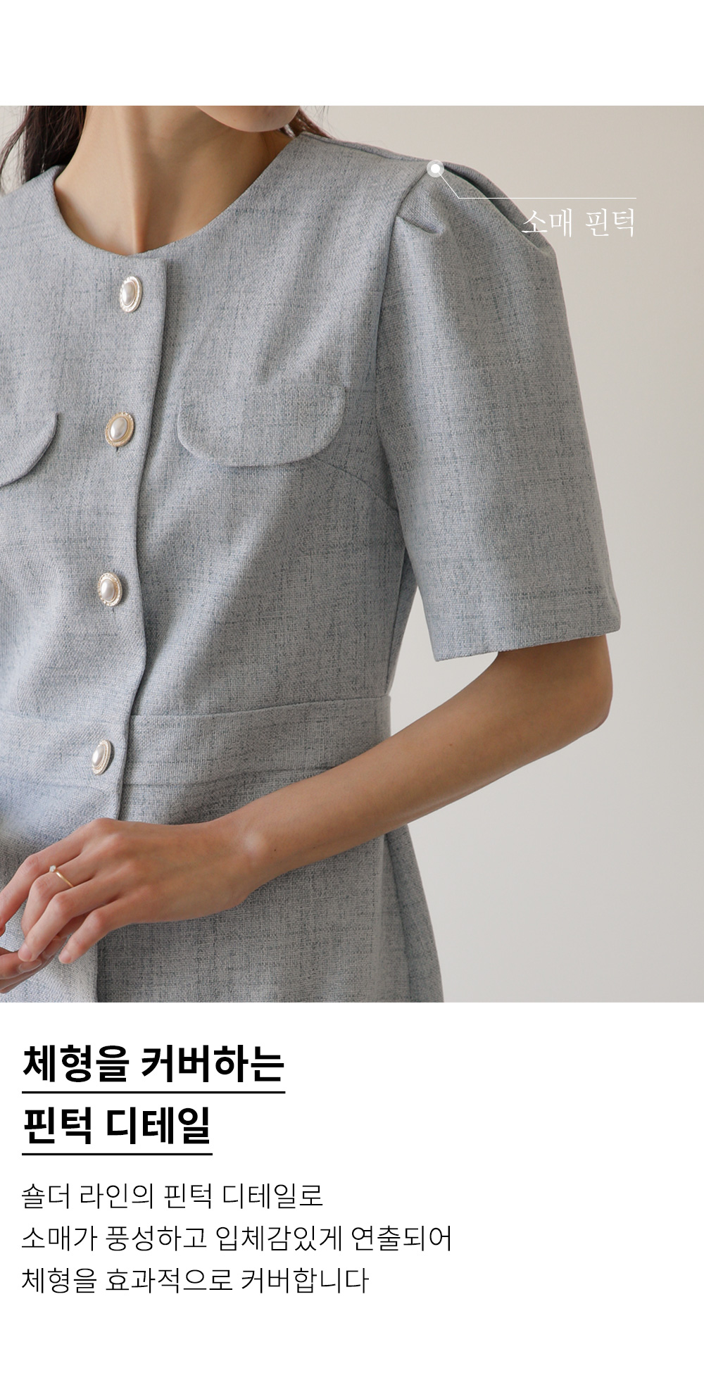 리타인 반팔 원피스 고급스러운 무드의 원피스를 소개할게요내추럴한 컬러감의 실이 여러겹으로 짜여 산뜻하고 경쾌한 무드를 선사해드리구요 단단하게 직조 편직된 소재감에 슬림한 핏감으로 실루엣을 정돈해 세련된 아웃핏을 연출해주었어요 숄더 라인의 핀턱 디테일로 소매를 풍성하게 연출해 팔뚝 군살을 효과적으로 커버해주었구요 뒷면의 히든 지퍼로 간편한 탈,착의가 가능하답니다 허리의 단작 디테일로 고급스럽고 깔끔하게 마무리되며 슬림해보이고 여성스러운 실루엣을 연출하구요 살짝 위로 디자인되어 다리가 길어보이는 효과까지 더했답니다 바스트의 페이크 포켓으로 미니멀한 포인트를 더하고 골드가 더해진 진주 버튼으로 엔틱하고 고급스러운 무드를 연출해주었어요 감각적이고 세련된 디테일이 가득한 아이템으로 하나만으로도 멋스러운 스타일링을 완성할 수 있구요 하객룩, 오피스룩 등 격식있는 자리에서 즐기시길 추천드려요 정 사이즈로 제작되었습니다